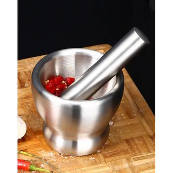 هاون معدني صغير مصنوع من الفولاذ اللامع. الهاون مثبت على سطح خشبي مجدول، وبداخله ظاهر بعض قطع الفلفل الأحمر. مقبض الهاون مصنوع من معدن سميك، مما يمنحه مظهرًا قويًا وقادرًا على طحن وسحق المواد الغذائية الصلبة.