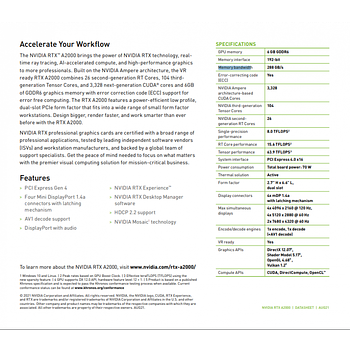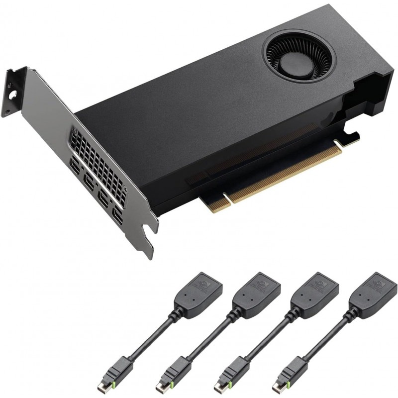 - بطاقة رسومات NVIDIA RTX A2000 بسعة 6 جيجابايت، معمارية NVIDIA Ampere، 3328 نواة NVIDIA® CUDA®، 104 نوى NVIDIA® Tensor، 26 نواة NVIDIA® RT، ذاكرة GDDR6 بسعة 6 جيجابايت مع تصحيح الأخطاء ECC، عرض نطاق ترددي للذاكرة يصل إلى 288 جيجابايت/ثانية، أقصى استهلاك للطاقة: 70 واط، ناقل الرسومات: PCI-E 4.0 x16، نظام التبريد: نشط، منافذ العرض: mDP 1.4 (4)