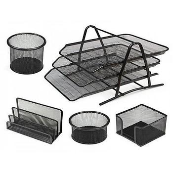 ✅ القطع هي: منظم معدني مكون من 3 طبقات حجم ورق ايه 4، حامل أقلام دائري شبكي طويل لتخزين الأقلام، حامل أقلام معدني دائري صغير، حامل مظاريف ورسائل مكون 3 أقسام، حامل ورق ملاحظات 4×4 معدني مربع.