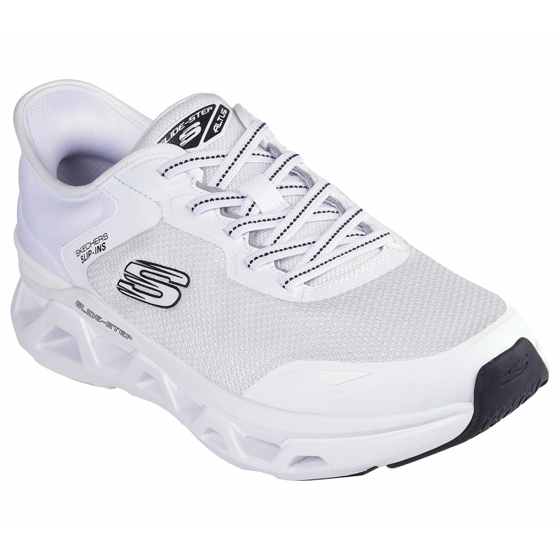 ? الخامة: جزء علوي شبكي مع طبقات اصطناعية Hotmelt لمظهر عصري ودعم إضافي.? الإغلاق: أربطة مطاطية مرنة لسهولة الارتداء والخلع.? الارتفاع: كعب بارتفاع 1.75 إنش لتوسيد إضافي وراحة مثالية.? التصميم: عصري، خفيف الوزن، ومناسب لجميع الأوقات.? اللون: أبيض أنيق بتفاصيل سوداء ولمسات رياضية مميزة.? الشعار: تفاصيل شعار Skechers® لمظهر مميز.