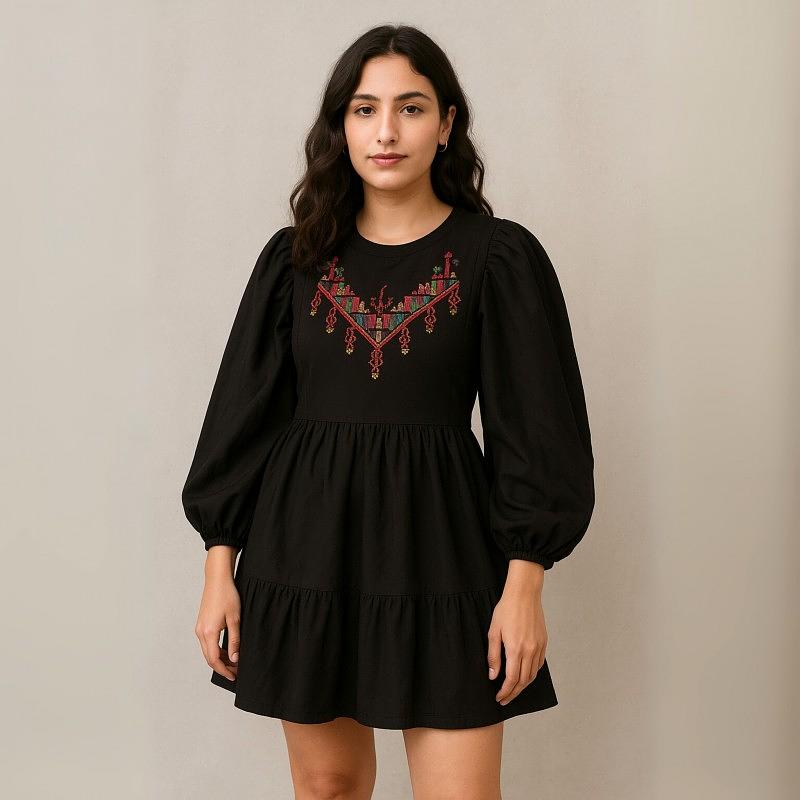 قميص لون أسود طويل تطريز أحمر طرف واحد