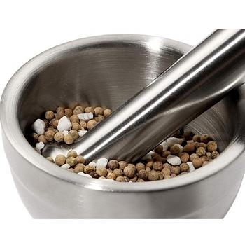 هاون معدني صغير مصنوع من الفولاذ اللامع. الهاون مثبت على سطح خشبي مجدول، وبداخله ظاهر بعض قطع الفلفل الأحمر. مقبض الهاون مصنوع من معدن سميك، مما يمنحه مظهرًا قويًا وقادرًا على طحن وسحق المواد الغذائية الصلبة.