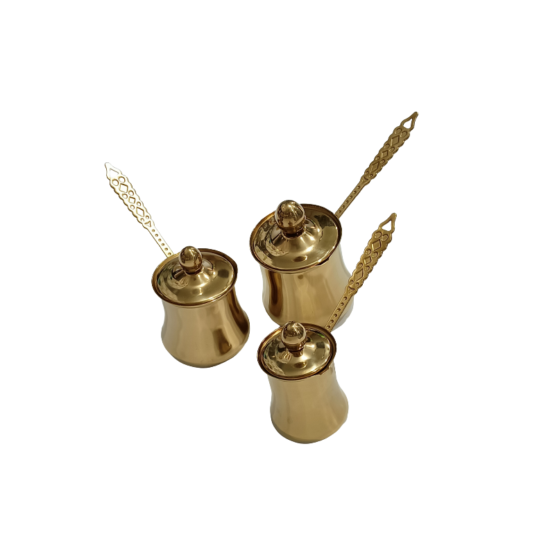 مع طقم ثلاث بكارج قهوة ثقيلة ذهبي مع غطاء، سيكون لديك الطقم المثالي لتقديم القهوة بطريقة مميزة. التصميم الفاخر واللون الذهبي اللامع يجعلان منه طقمًا لا غنى عنه في كل مناسبة، سواء كانت رسمية أو اجتماعية، ليضفي على لحظاتك طابعًا خاصًا وفاخرًا.
