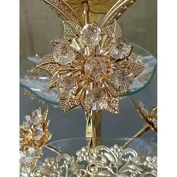 تُظهر مضيفة أو قطعة عرض ذات تصميم فاخر مصنوعة من الذهب والزجاج. تتميز القاعدة بزخارف ذهبية مزخرفة برقيقة ونقوش نباتية دقيقة. وفوقها يوجد طبق زجاجي مدعوم بهيكل معدني مذهب بتفاصيل زخرفية غنية.