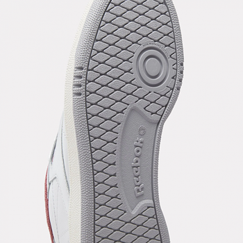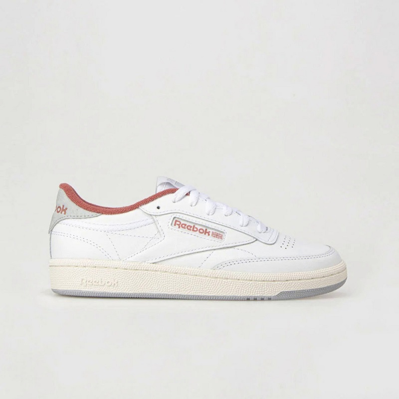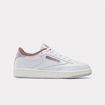 - Reebok Women's Club C 85 Shoes A RETRO SNEAKER WITH VINTAGE DETAILSJoin the club: inspired by the original Club C, the 85 pays homage to the courtside favourite with its sleek, tennis-inspired design. A red fleece lining adds a hint of colour, while the reinforced toe cap, perforation and rubber sole nod to the style’s hallmarks. White, dark red, light grey Logo print at heel panel and windowbox Padded ankle collar and tongue Moulded sockliner Logo-print tab at tongue Perforation at toe box Reinforced toe cap EVA foam midsole with embossed logo Rubber outsole Lace-up front fastening Style ID: 100033087
